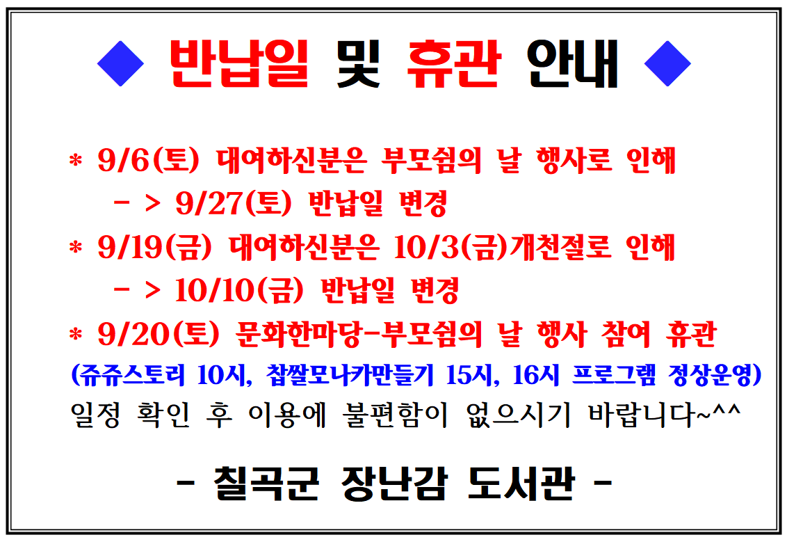 반납일 변경 및 휴관 안내